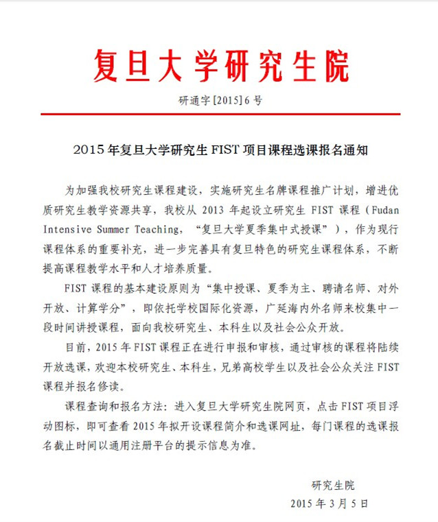 2015年复旦大学研究生FIST项目课程选课报名通知