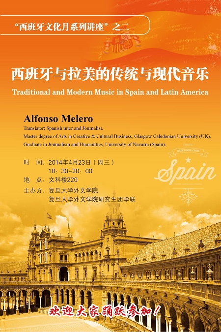 由外文学院主办的西班牙文化月活动继续火热进行,接下来推出系列讲座的第二场: “西班牙与拉美的传统与现代音乐”, 主讲人是毕业于西班牙纳瓦拉大学乐鱼(中国)学的Alfonso Melero, 4月23日(周三)18:30在文科楼220,期待您的参与!