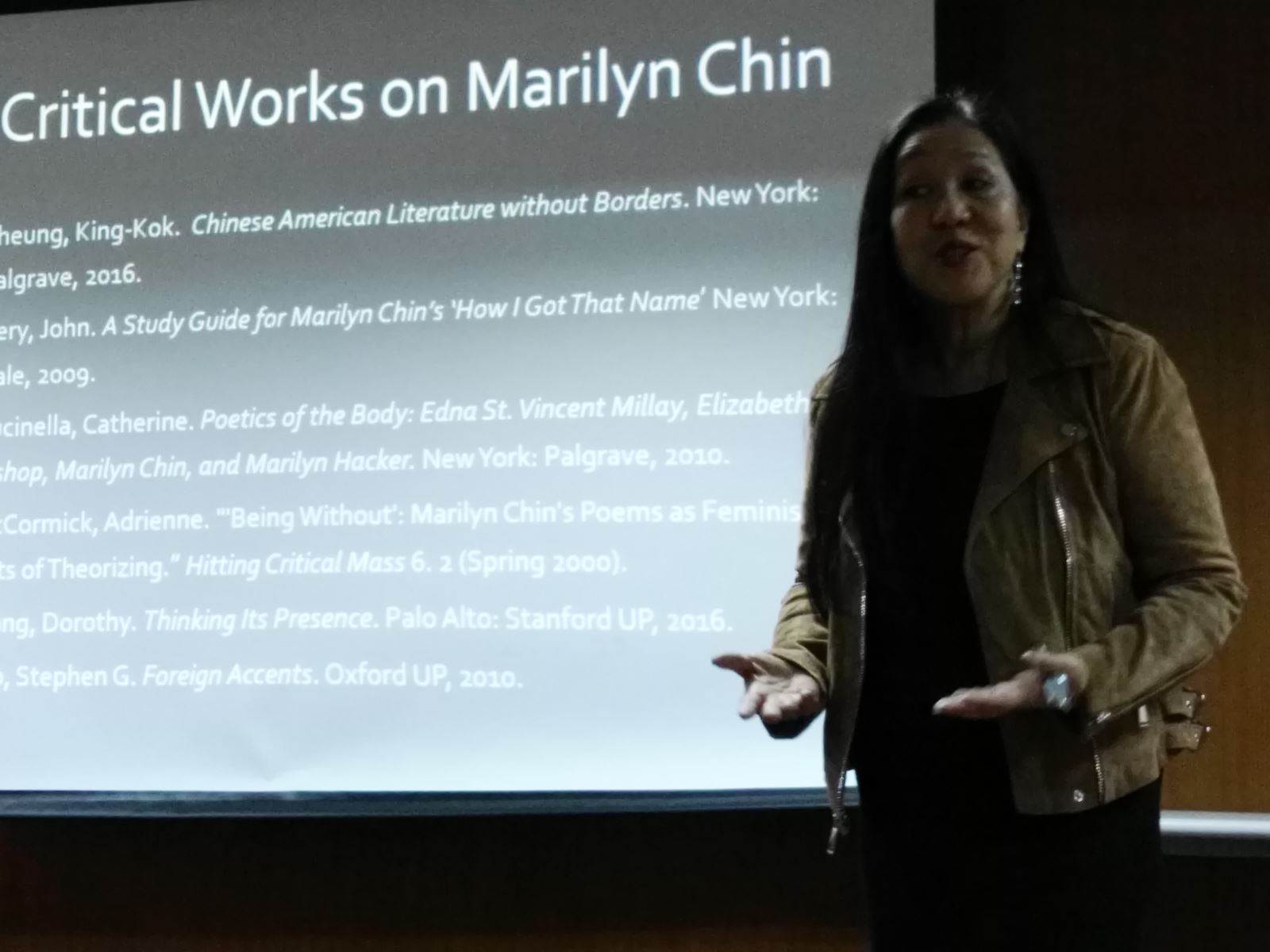 曾经在美国国会图书馆朗读过自己诗歌的Marilyn Chin陈美玲于11月15日下午来到了文科楼209举办了题为“Chinese Allusions and Gender Ambiguities in Marilyn Chin’s Poetry”的诗歌创作艺术朗诵会。
