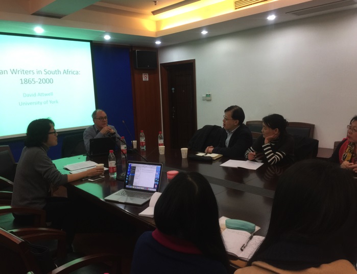 2016年12月8日下午,文科楼220会议室,英国约克大学英语和相关文学系系主任、著名殖民主义文学研究学者大卫·阿特维尔教授(David Attwell)给复旦师生作了一场题为《南非文学中的非洲作家:去殖民化的文学历史》(African Writers in South African Literature: A Literary History of Decolonization )的精彩讲座。本次讲座由英文系副系主任段枫老师主持,复旦大学英文系系主任朱建新老师、张琼老师出席了讲座并参与了其后的讨论。