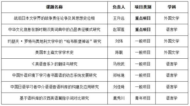 6月21日,在最新公布的2018年国家社科基金年度项目和青年项目立项结果中,外文学院共有8位老师的项目获得立项,其中重点项目2项,一般项目5项,青年项目1项,成绩喜人。近年来,外文学院高度重视学术研究工作,此次国家社会科学基金项目申报,外文学院充分动员、积极组织教师申报,并针对拟申报项目举行了专门的论证指导会,最终共申报13个项目,其中8个项目获得成功立项,立项率达到61.54%。