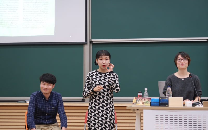 10月12日,由法文系主办,名为“照亮”、以介绍中世纪手抄本为主题的学术讲座在5102顺利举行。讲座由法文系陈杰老师主持,来自索邦大学的胡葳博士和来自英文系的包慧怡老师担任嘉宾。讲座受到了校内师生的热烈欢迎,100多个座位的阶梯教室被挤得满满当当,不少找不到座位的同学只能在讲台前席地而坐。三位老师围绕着中世纪手抄本的历史、记忆与实践三个方面展开精彩对谈,带领在场师生进行了一场丰富有趣的中世纪探秘之旅。
