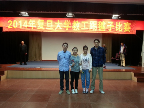 2014年11月4日,外文学院工会由工会体育委员郭一诚带队,组织参加了由校工会举办的第一届踢毽子比赛。经过激烈角逐,在25支参赛队伍中勇超12支代表队,取得了团体第13名的佳绩。参赛代表吴宝雷、郑阳、殷婷婷、管阳阳在强手如林的赛场上,沉着镇定,忙而不慌,愈战愈勇,在规定时间一分钟内把毽子踢得上下飞舞,赢得现场一阵阵喝彩声。最终,外文学院的选手老师不负众望,经过积极备战,顽强拼搏,终于勇克众强,为学院赢得了荣誉。