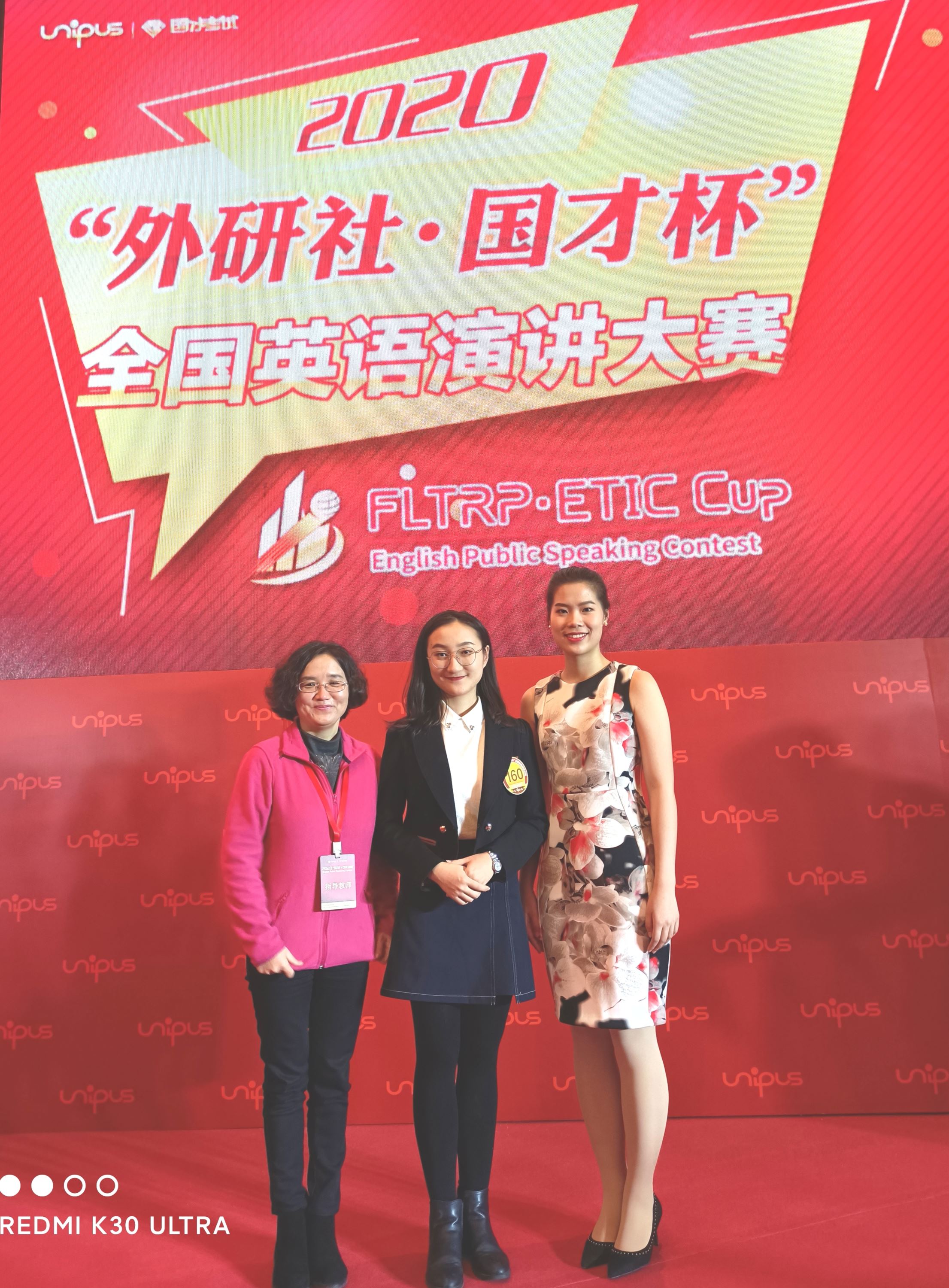 (杨康绮在参赛中) (左起:指导老师时丽娜、杨康绮、主持人傅之君)