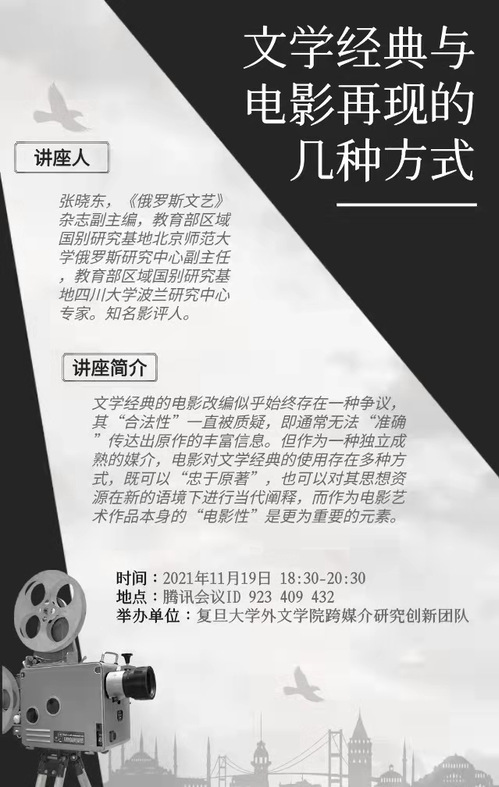 11月19日,北京师范大学俄罗斯研究中心副主任、《俄罗斯文艺》副主编、教育部区域国别研究基地中心副主任、知名影评人张晓东受“跨媒介文化研究创新团队”邀请,为外文学院师生做了题为“文学经典与电影再现的几种方式”的讲座。讲座由俄文系副教授李新梅主持,近百名师生参与。