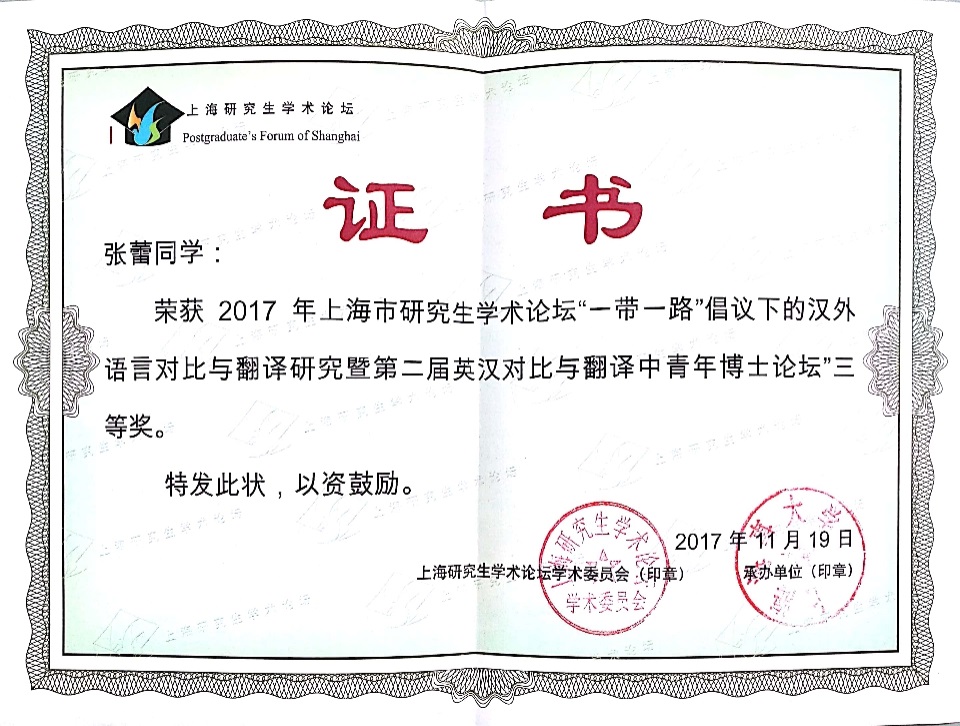 2017年11月17-19日,在上海海事大学举办的“2017年上海市研究生学术论坛”(“一带一路”倡议下的汉外对比与翻译研究暨第二届英汉对比与翻译中青年博士论坛)中,我校外文学院韩文系博士研究生张蕾同学(姜宝有教授指导)荣获三等奖。此次论坛由上海市学位委员会办公室主办、上海海事大学研究生院与上海海事大学外国语学院承办、《上海翻译》编辑部协办。中国英汉语比较研究会名誉会长、华东师范大学终身教授潘文国教授、上海外国语大学许余龙教授、北京师范大学周流溪教授、复旦大学陶友兰教授、上海交通大学胡开宝教授等知名学者出席了此次会议。来自伦敦大学、香港理工大学、北京外国语大学等44所海内外高校的46位中青年博士及硕士研究生在会上宣读论文并进行讨论。