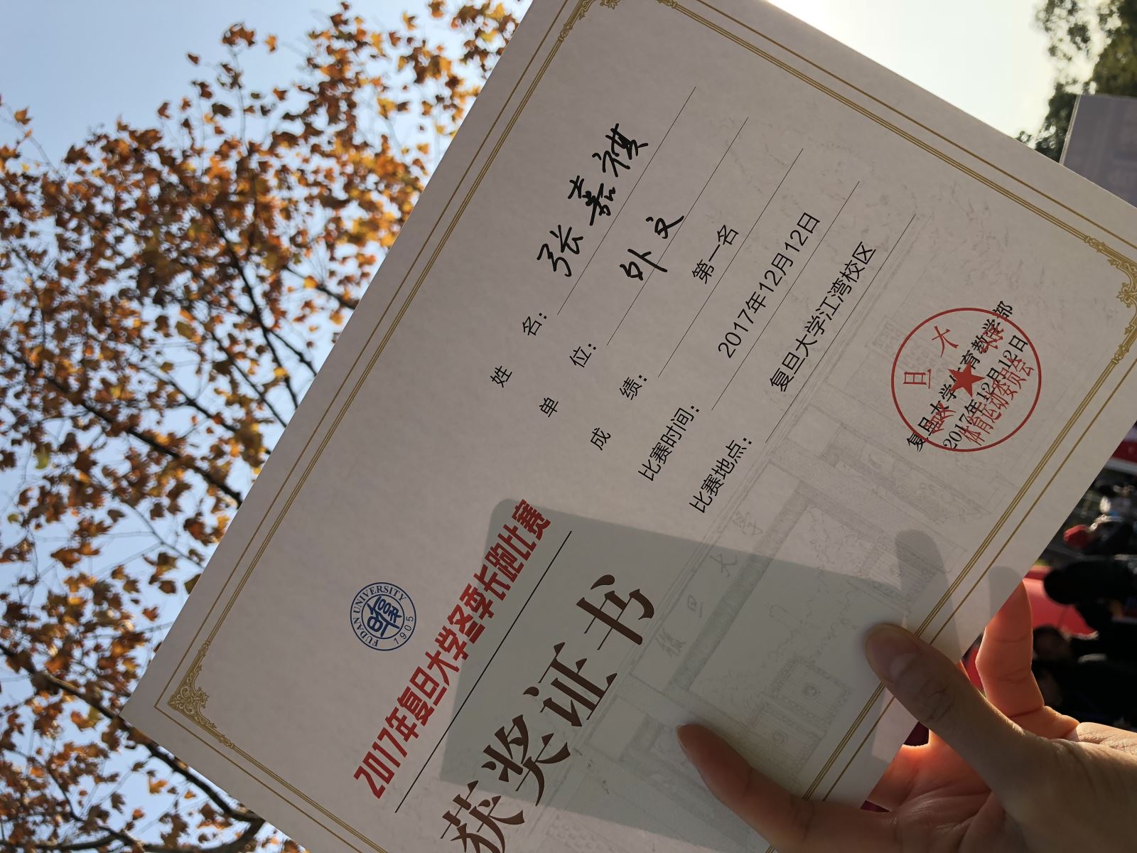 外文学院派出9名学生组成代表队参加比赛,距离约为2.5至3公里,分男、女两组进行。外院学生不畏严寒,相互鼓励,顺利完成比赛。最终,经过紧张激烈的角逐,外文学院荣获2017年复旦大学冬季长跑比赛团体第七名及女子团体亚军, 17级小语种班张嘉祺同学获得本次比赛第一名!