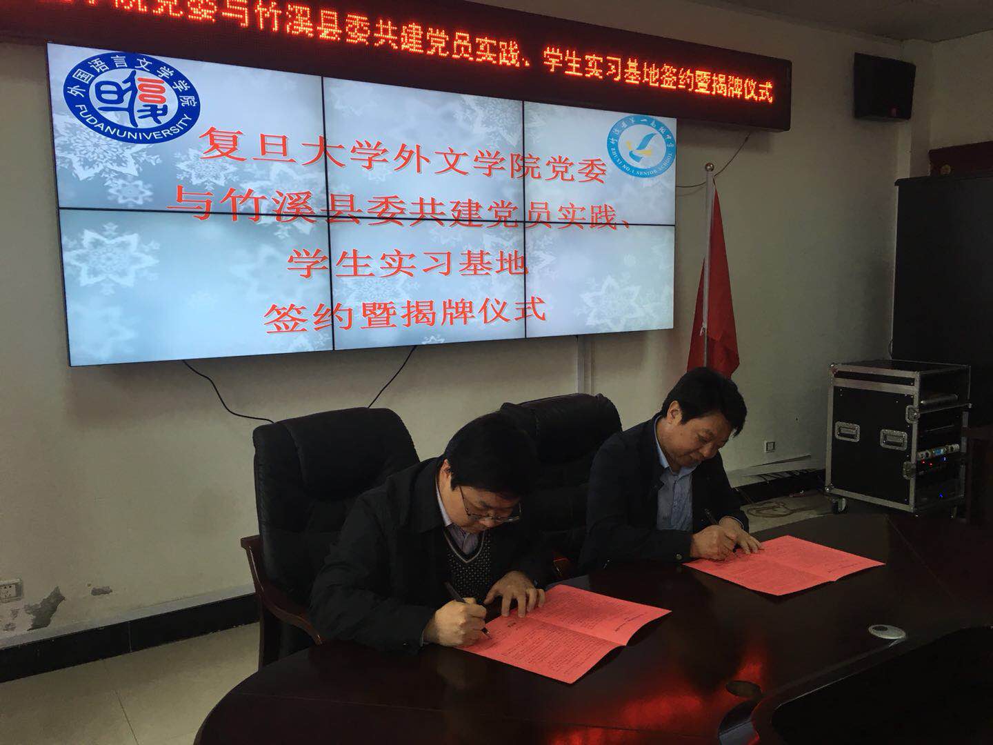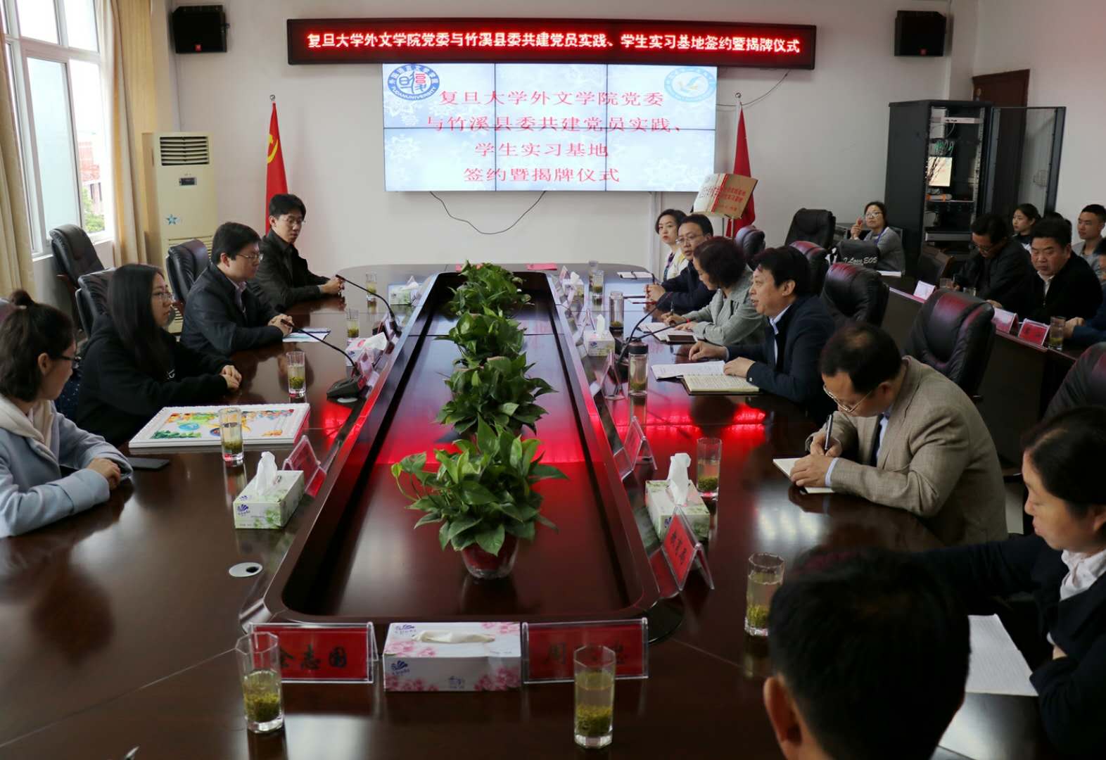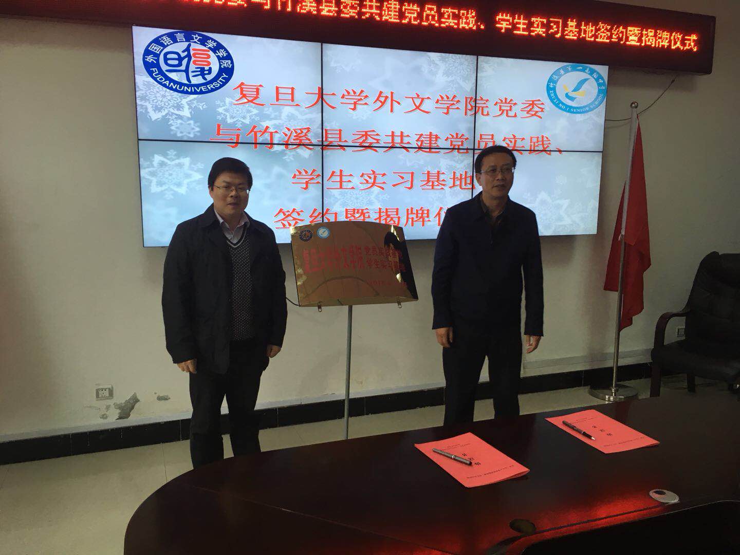 2018年4月13日上午,复旦大学外文学院党委与竹溪县委共建党员实践基地、学生实习基地签约暨揭牌仪式在竹溪县第一中学明德楼举行。外文学院党委副书记赵昕,竹溪县委常委、组织部长胡贤德,副县长杨巧燕等出席签约揭牌仪式。仪式上,双方签署协议、为基地揭牌,外文学院和县一中还互赠了纪念品。