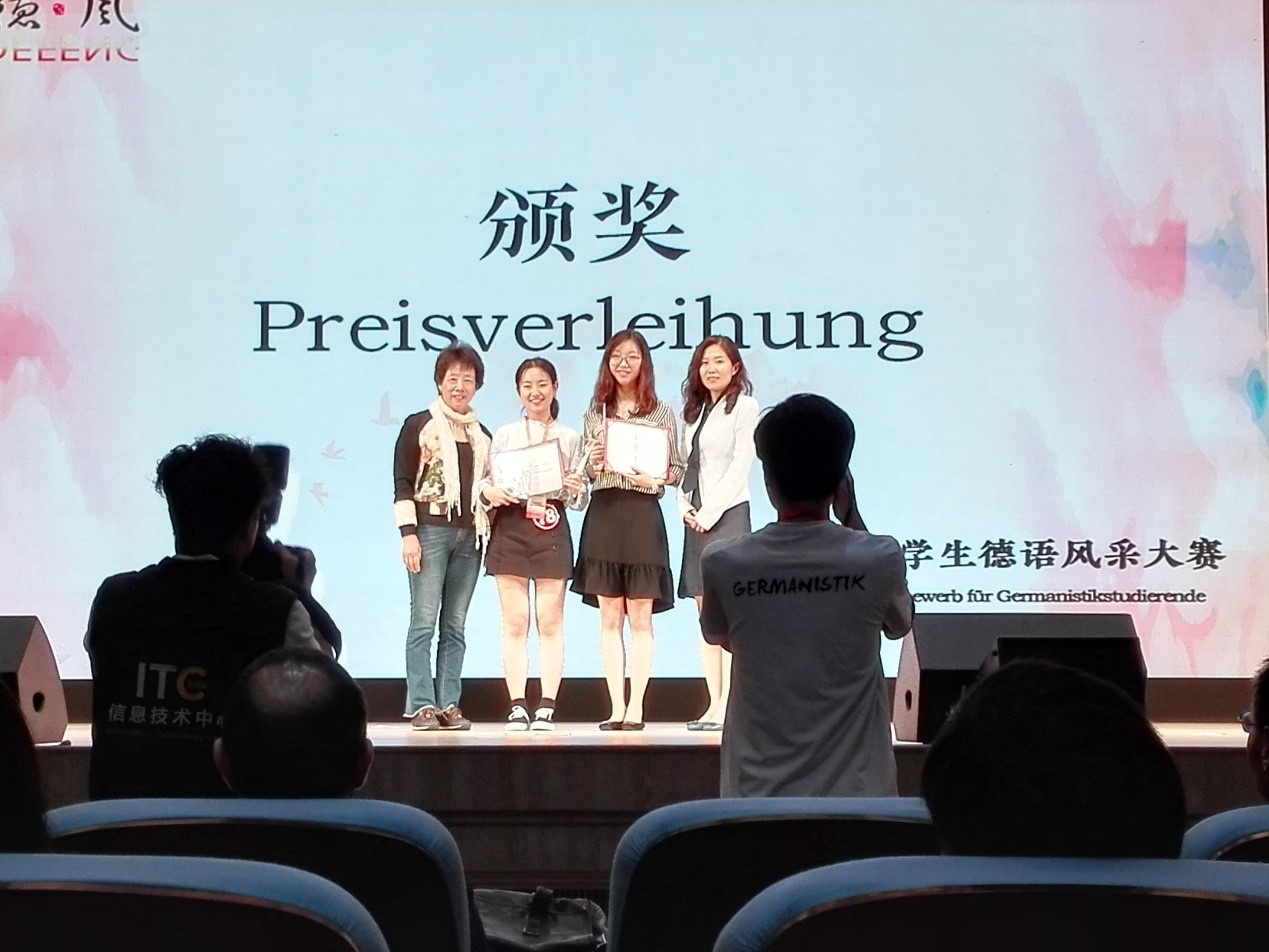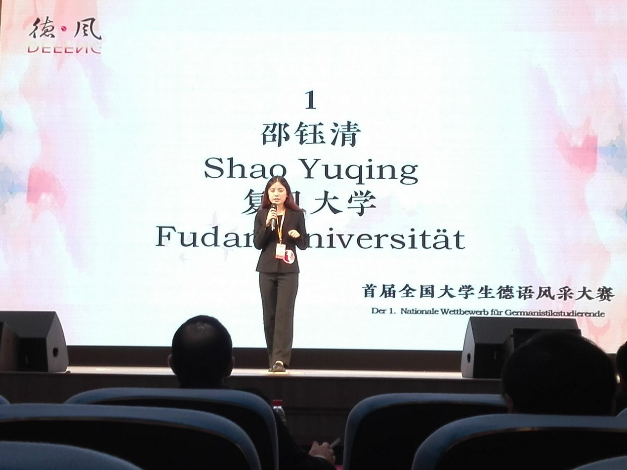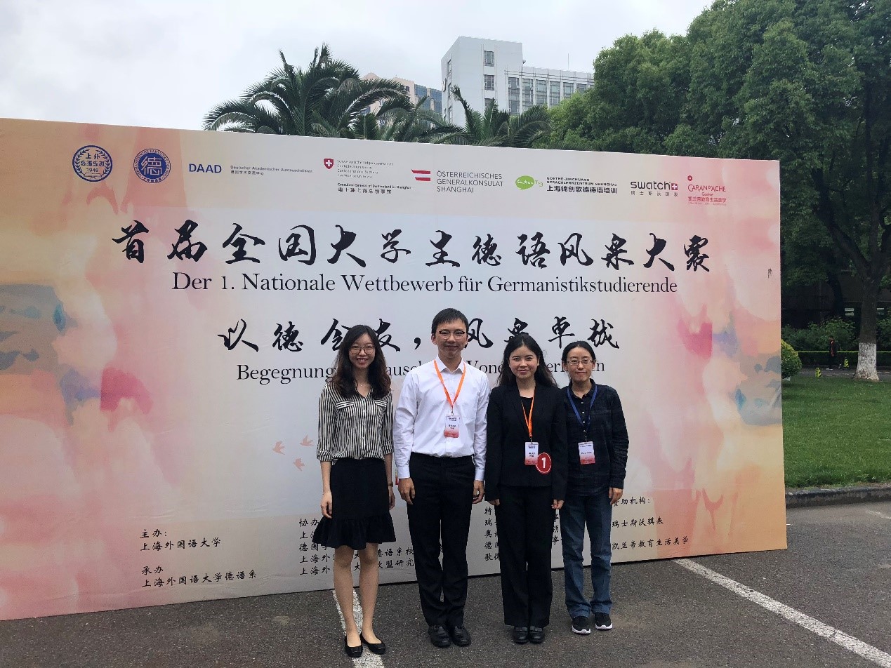 2018年5月20日,首届全国大学生德语风采大赛在上海外国语大学举办。德文系徐璟瑶、邵钰清、张政三位同学代表复旦大学参加比赛,德文系秦文汶老师带队指导。比赛设有命题演讲、即兴演讲、知识竞赛等环节,复旦大学代表队与来自全国七所高校的二十多位选手同台竞技,展开激烈角逐。三位同学展现了深厚的专业素养和出色的综合能力,在比赛各环节均获得高分,受到在场师生一致好评。最终复旦大学代表队夺得大赛团体一等奖,徐璟瑶同学还荣获命题演讲最佳选手。