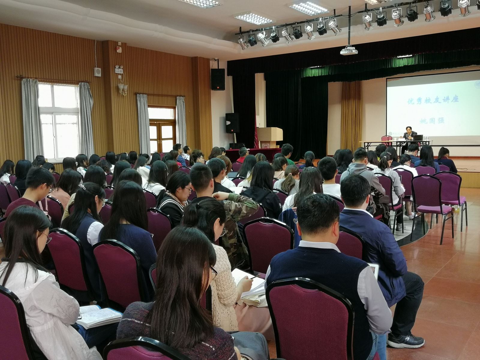 5月14日下午,外文学院分党委于工会礼堂举行第三期优秀校友讲坛暨第三期入党积极分子培训班、第二期党支部书记(骨干)培训班专题讲座。1977级法文系校友姚国强先生重返校园,为外文学院师生作了题为《4年大学与40年精彩人生——探讨外语的可能性》的精彩讲座。讲座由法文系系主任袁莉主持,近百名师生参加讲座。