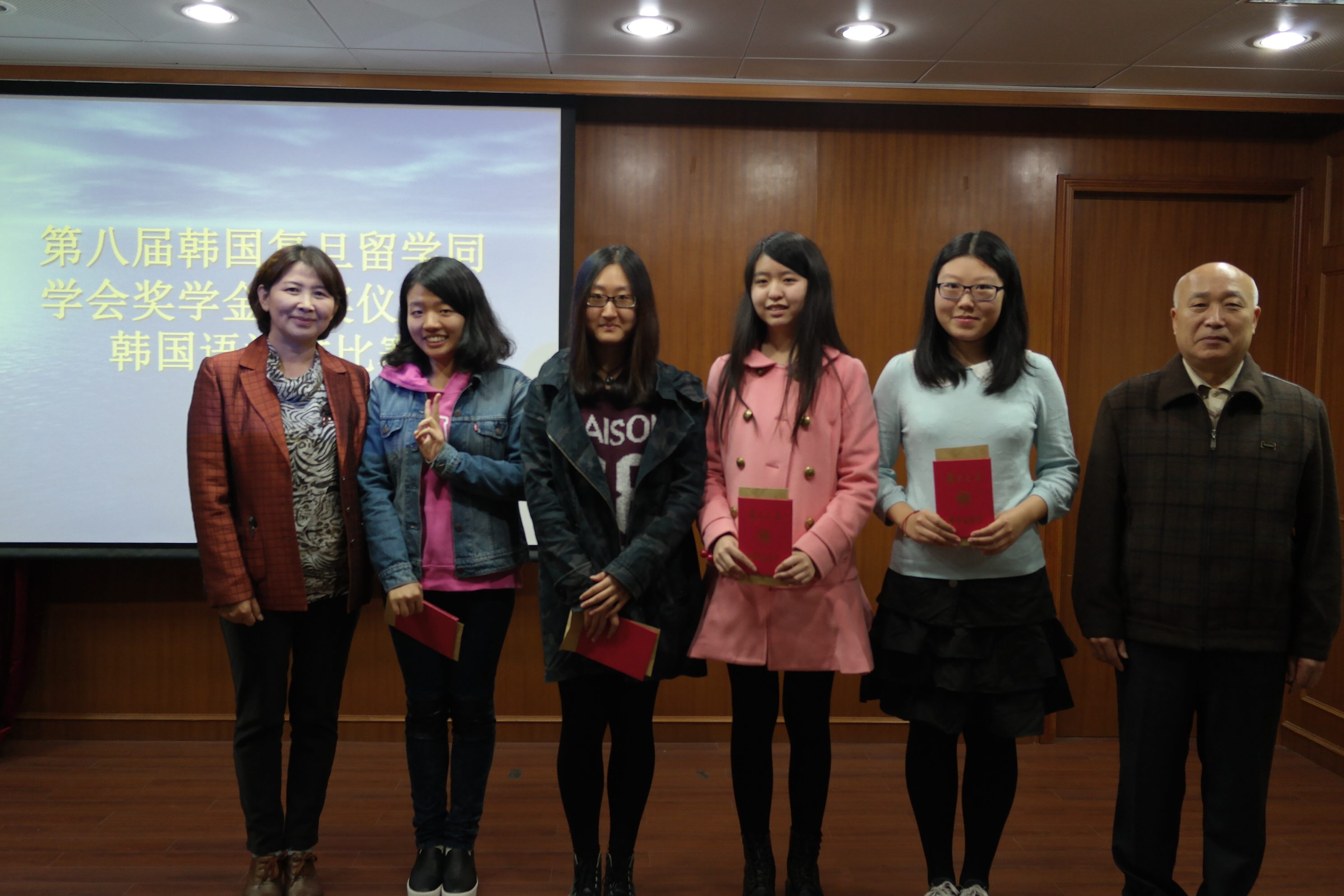 2015年11月13日,韩国语系全体师生在文科楼209室举行了“第八届韩国复旦留学同学会奖学金颁奖仪式暨锦湖韩亚杯韩国语演讲比赛校内选拔赛”。12级学生周子瑜,14级学生朱逸丹以及15级学生鲁佳妮、吕艾雨共4名学生分别获得奖学金1000元。颁奖仪式后举行了韩国语演讲比赛校内选拔赛。9名参赛学生经过激烈精彩的角逐,最后二年级张云睿、三年级余乐涵和四年级施一宽入选,将代表我校参加11月20日举行的“锦湖韩亚杯中国大学生韩国语演讲比赛上海地区预选赛”。