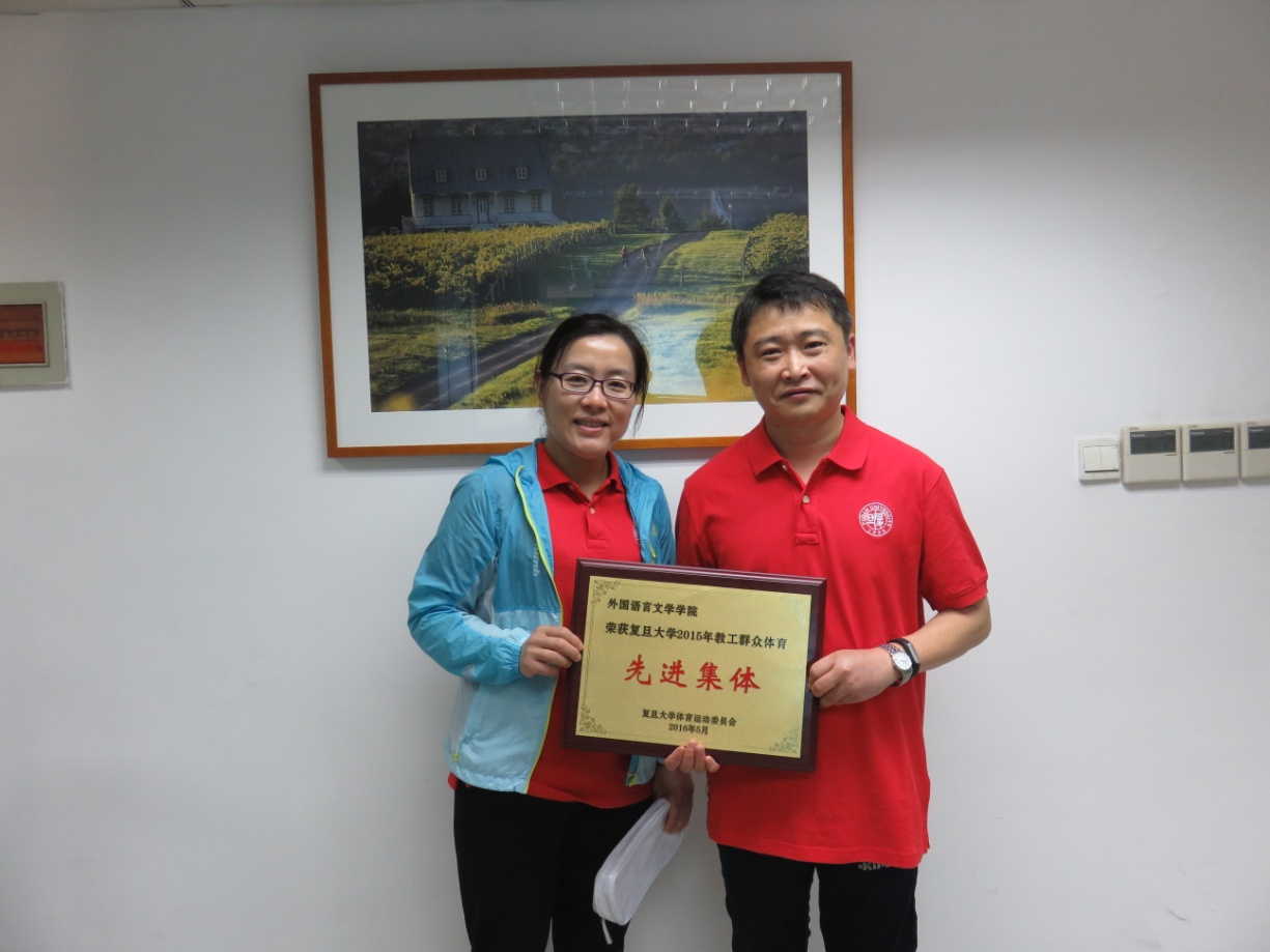 入场仪式结束后,学校对2015年在体育运动方面表现出色的学生团体及教工集体进行了表彰。我院荣获“2015年教工群众体育先进集体”奖章。郭一诚老师代表学院接受了这一荣誉。这一枚奖章是对学院广大教职工,尤其是克服重重困难、为了学院荣誉参加各种比赛的各位教职工的无私奉献精神的肯定与鼓励,同时也凝聚了外院工会2015年的辛勤汗水。今日之誉当为明日之标,鞭策着外院人继续努力,创造更大的辉煌。