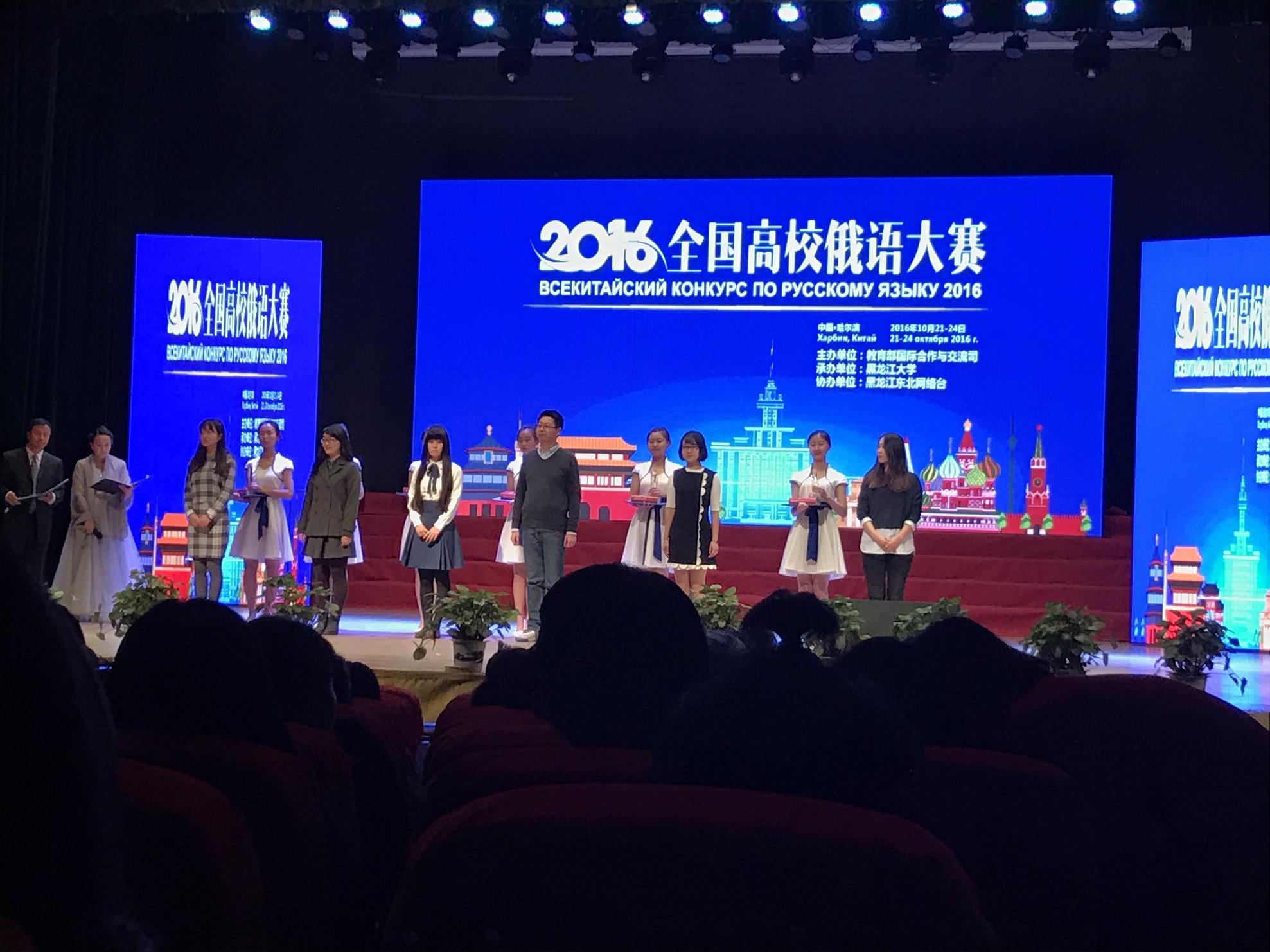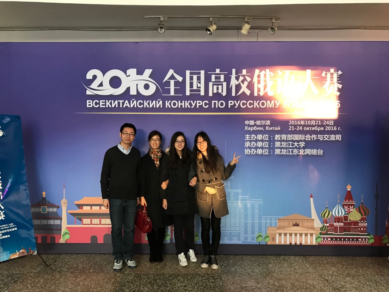 由教育部国际合作与交流司主办,黑龙江大学承办的全国高校俄语大赛于2016年10月21—23日在黑龙江大学举行。大赛设低年级组、高年级组和研究生组三个组别,吸引了来自126所大学的325名选手前来参赛。我院俄文系由纪春萍老师带队,许永健、谈晓雯、华茗仪三名学生参赛。经过3天的激烈角逐,许永健获得研究生组三等奖,谈晓雯、华茗仪分别在高年级组、低年级组演讲单项赛中有精彩表现。