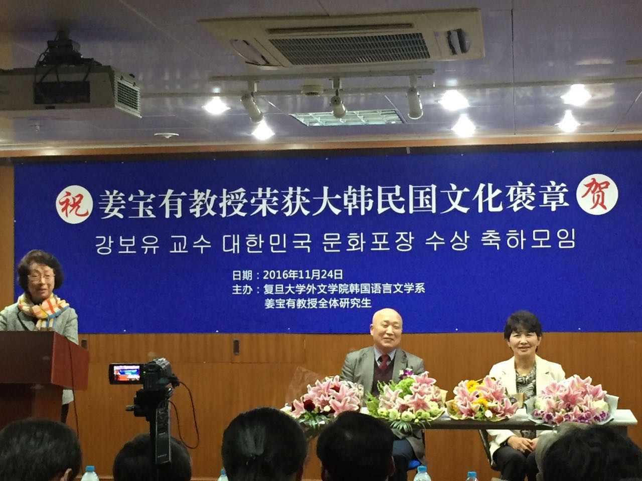 2016年11月24日下午,姜宝有教授荣获大韩民国文化褒章纪念活动在复旦大学文科楼209热烈召开。院长曲卫国、韩文系全体师生出席了本次纪念活动。此外,不少国内外韩国语领域著名教授以及姜教授的弟子们不远万里,带着真挚的祝福,和大家一同分享这份荣耀的喜悦。