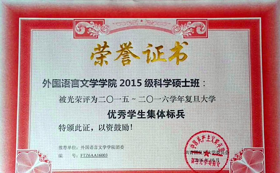 2015级科硕班荣获“2015-2016学年复旦大学优秀集体标兵”