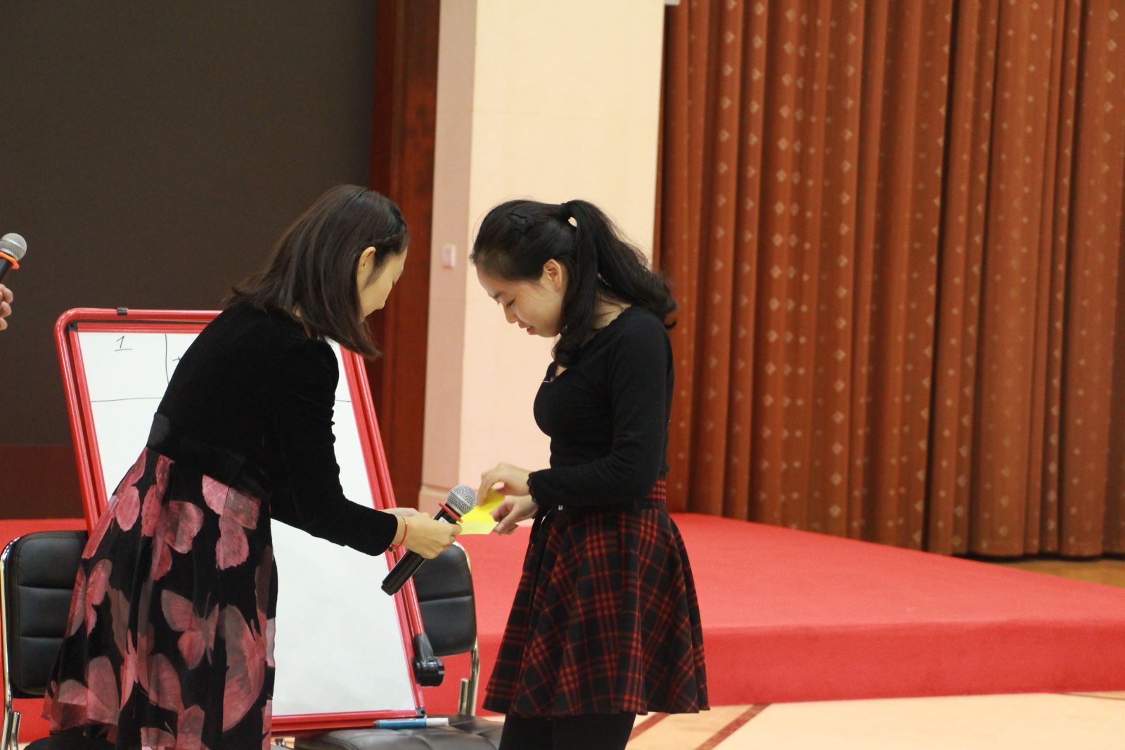 21世纪英文报在线教育事业部总编辑陈欢女士为直通卡得主政治大学王安棣、陈世贤和张恩扬颁奖
